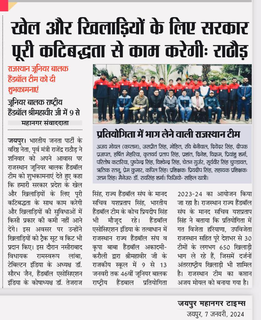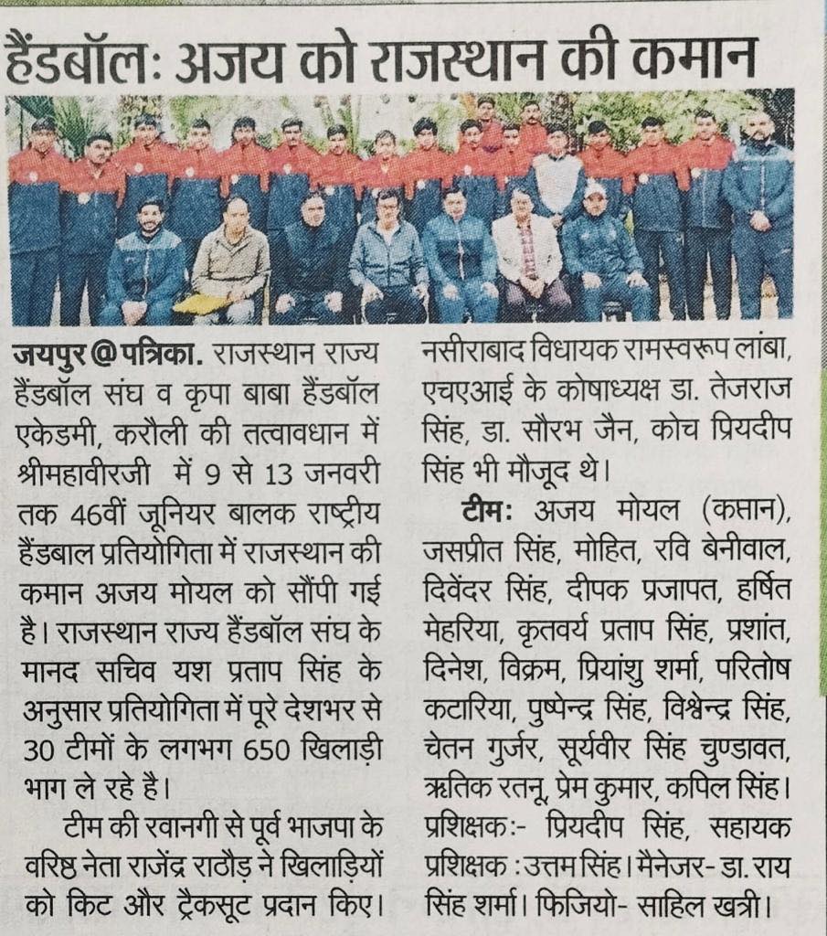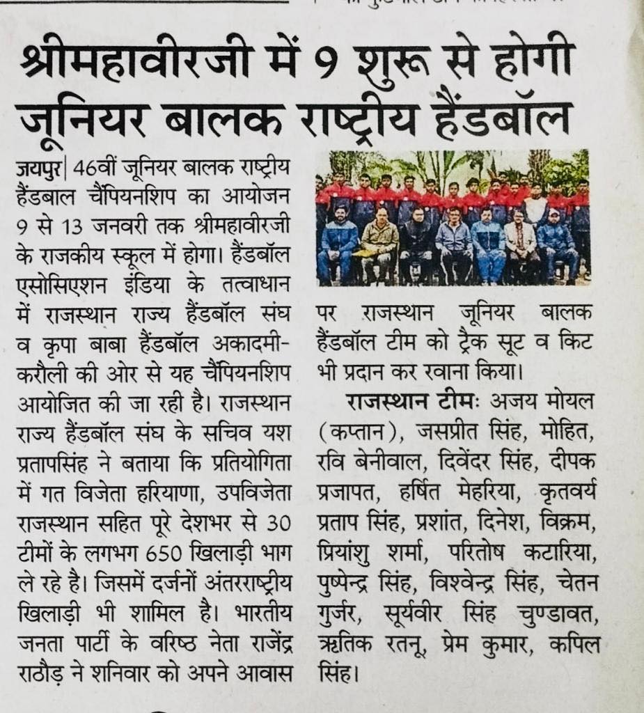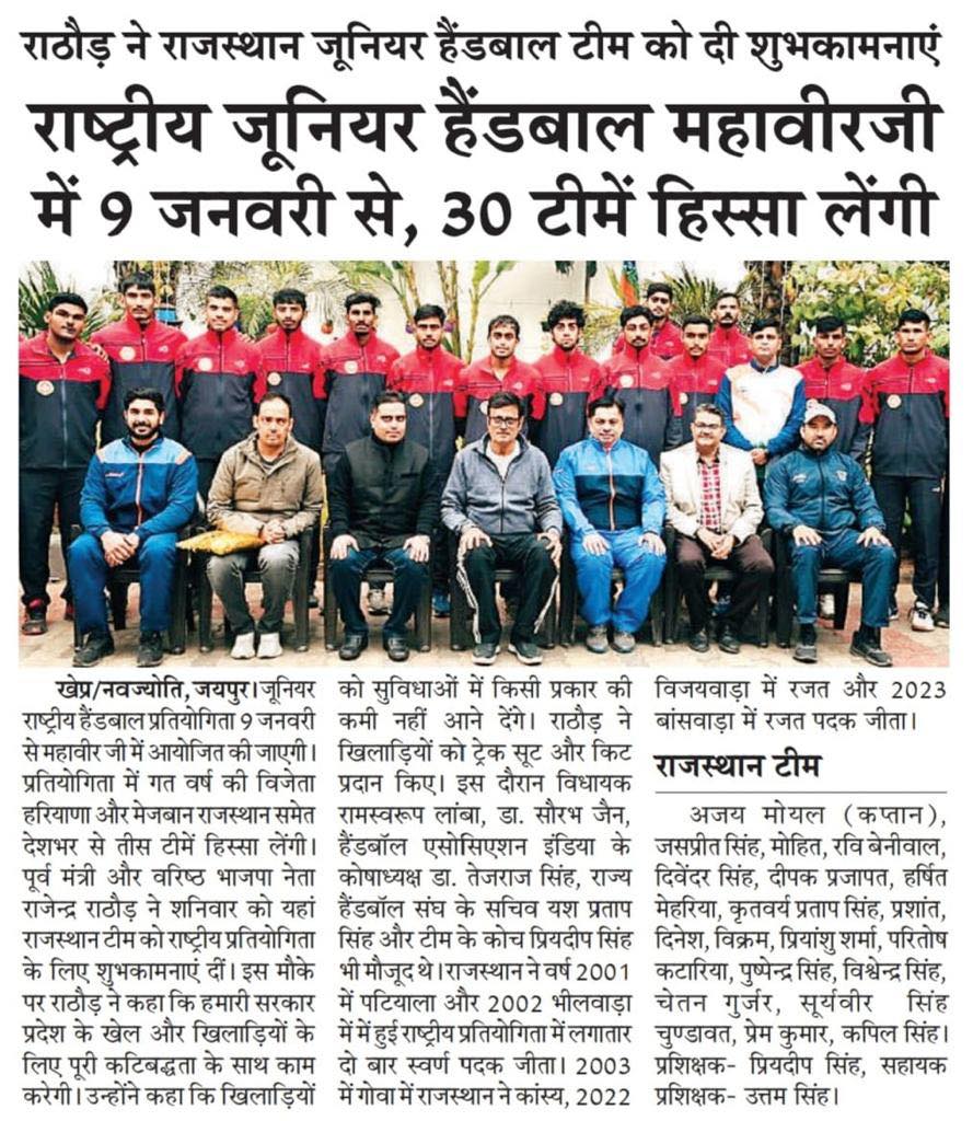 Teams will participate in the National Junior Handball Mahavirji from January 9.